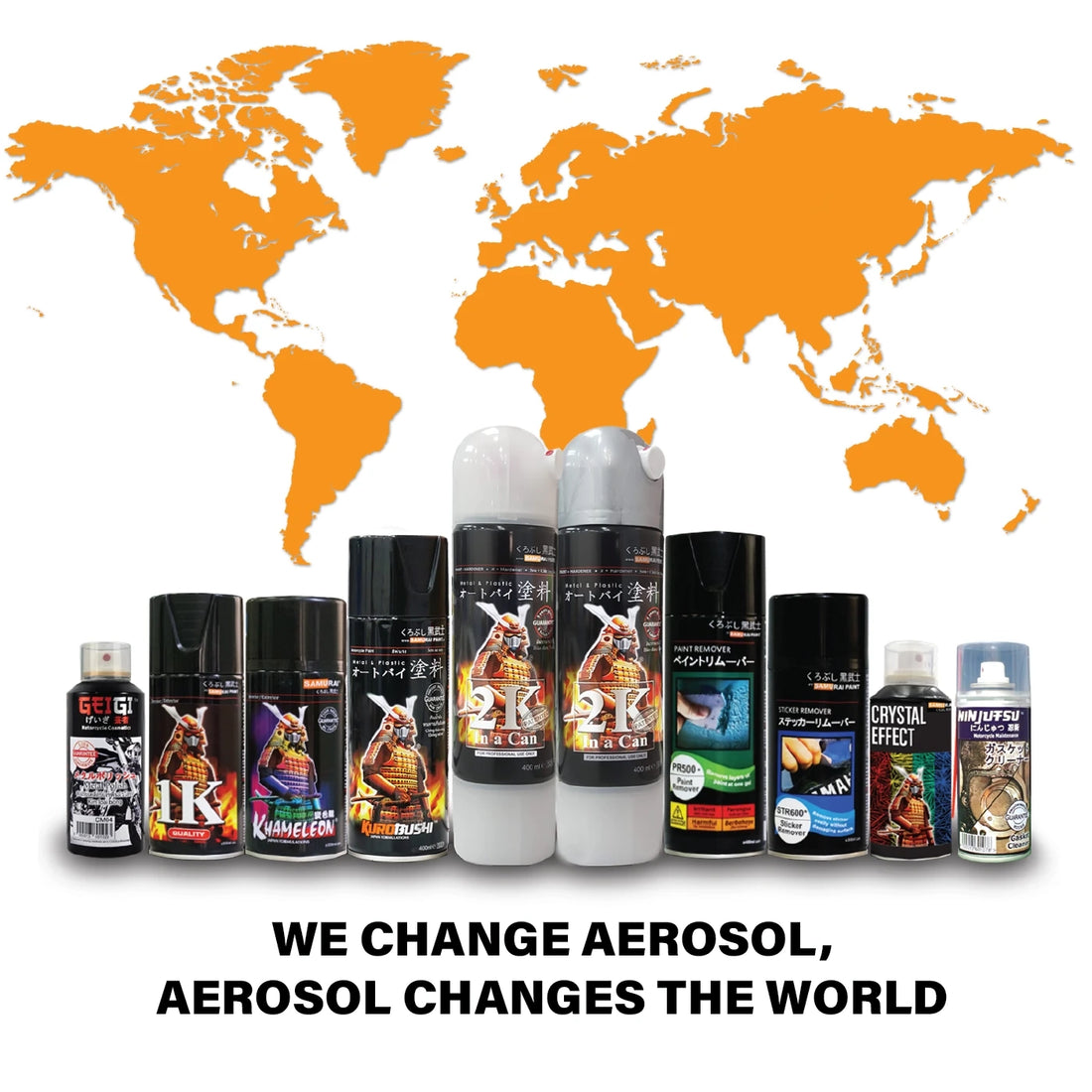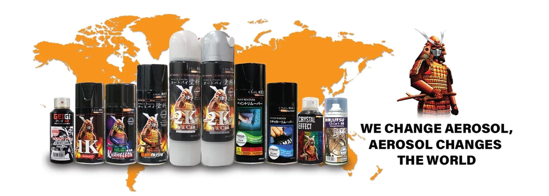 SAMURAI® range also includes products such as plastic primer, putty primer, paint remover, 1K clear coat, 3-Dimension paint (Khameleon), hi-temperature, engine part paint, sticker remover and peelable paint.
